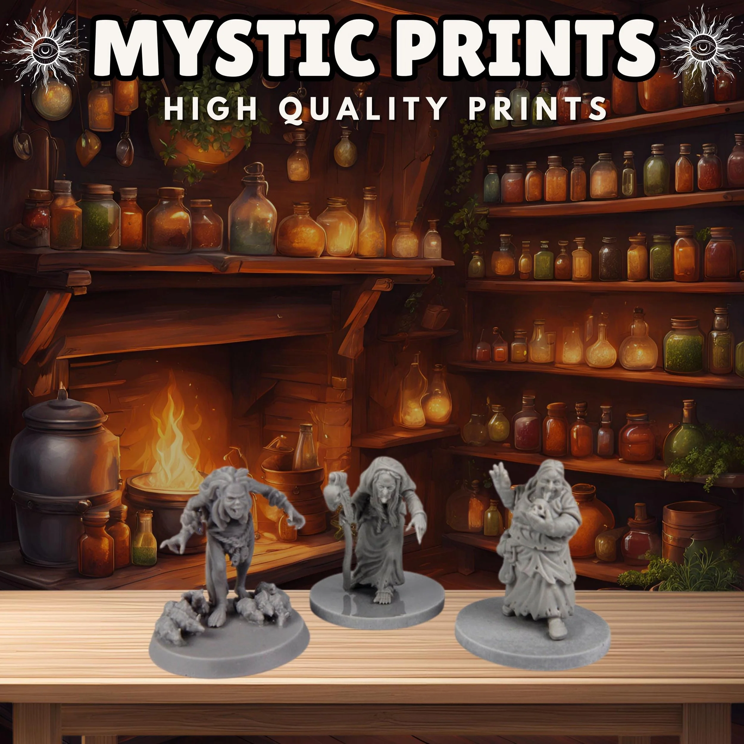 Welcome! Thank you for checking out Mystic Prints! We sell high quality fdm and resin 3D prints as well as custom apparel. Majority of the prints are for Rpgs and Tabletop games such as Dungeons and Dragons and Wargames. We have tons of stl files and can make any apparel that would fit your needs!