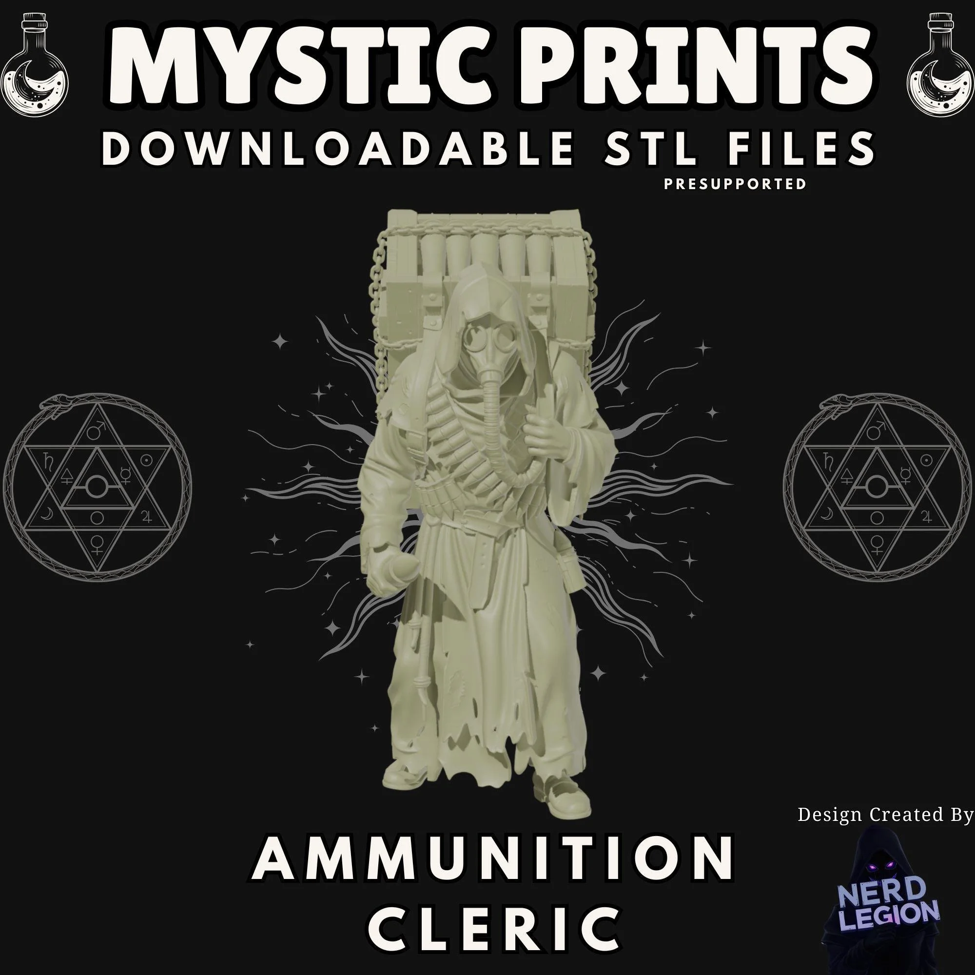 The sculpt captures the gritty reality of a holy war in the mud, featuring intricate gear, layered robes, and a heavy ammunition pack. This model is optimized for high-resolution resin printing, ensuring that every strap, shell, and filter on the gas mask prints with sharp, grim detail. Whether as a specialized unit or an objective marker, the Ammunition Cleric adds an unmistakable atmosphere of desolation to your tabletop.