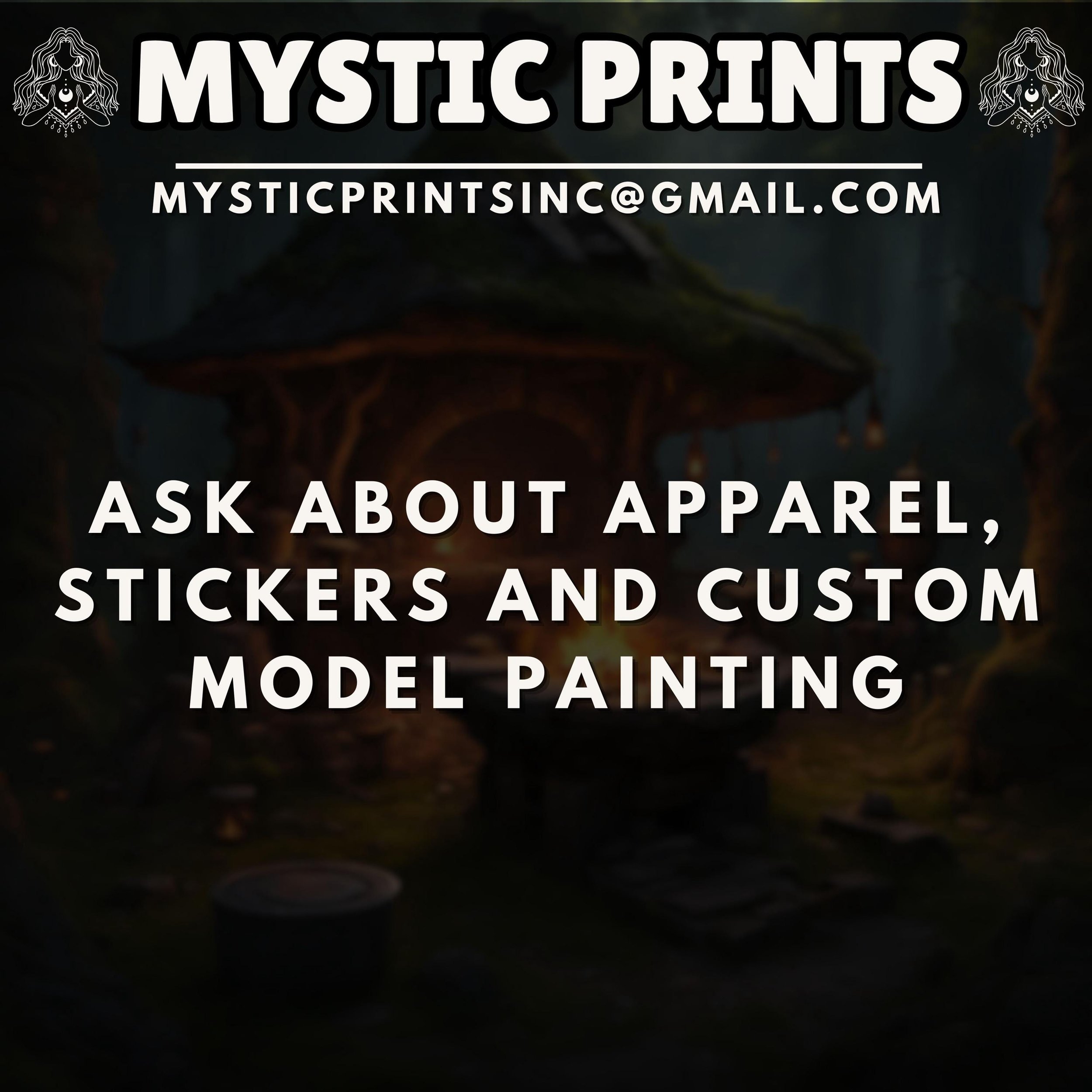 Welcome! Thank you for checking out Mystic Prints! We sell high quality fdm and resin 3D prints as well as custom apparel. Majority of the prints are for Rpgs and Tabletop games such as Dungeons and Dragons and Wargames. We have tons of stl files and can make any apparel that would fit your needs!