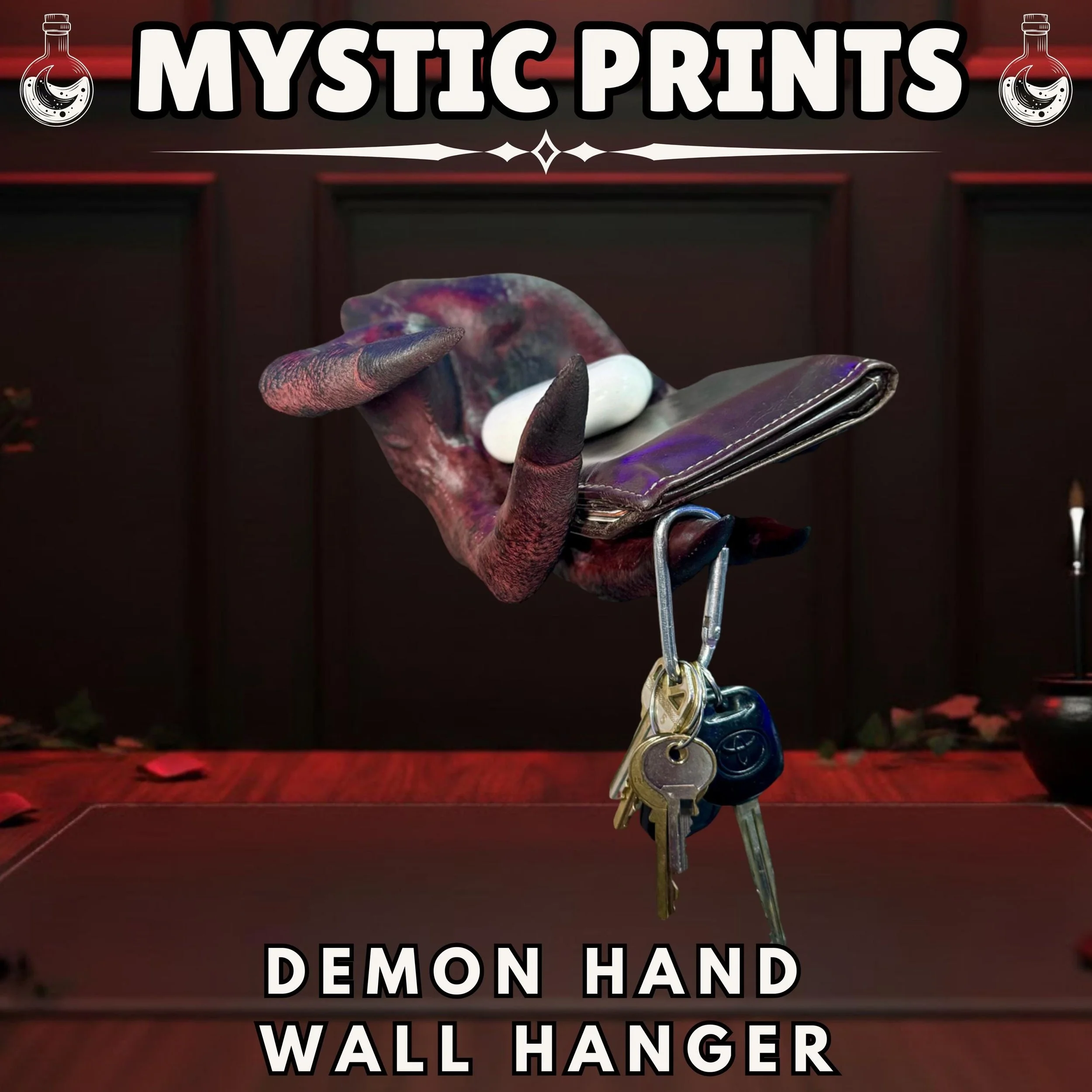 This highly detailed demonic hand features sharp claws and realistic skin textures, finished in a haunting deep red and purple hue. It is designed to mount securely to your wall, providing a sturdy palm to hold your wallet or earbuds, while the hooked fingers act as the perfect spot for your keys. Whether you are decorating a gothic home, a haunted entryway, or looking for a unique gift for a horror fan, this hand brings an unmistakable presence to any room.