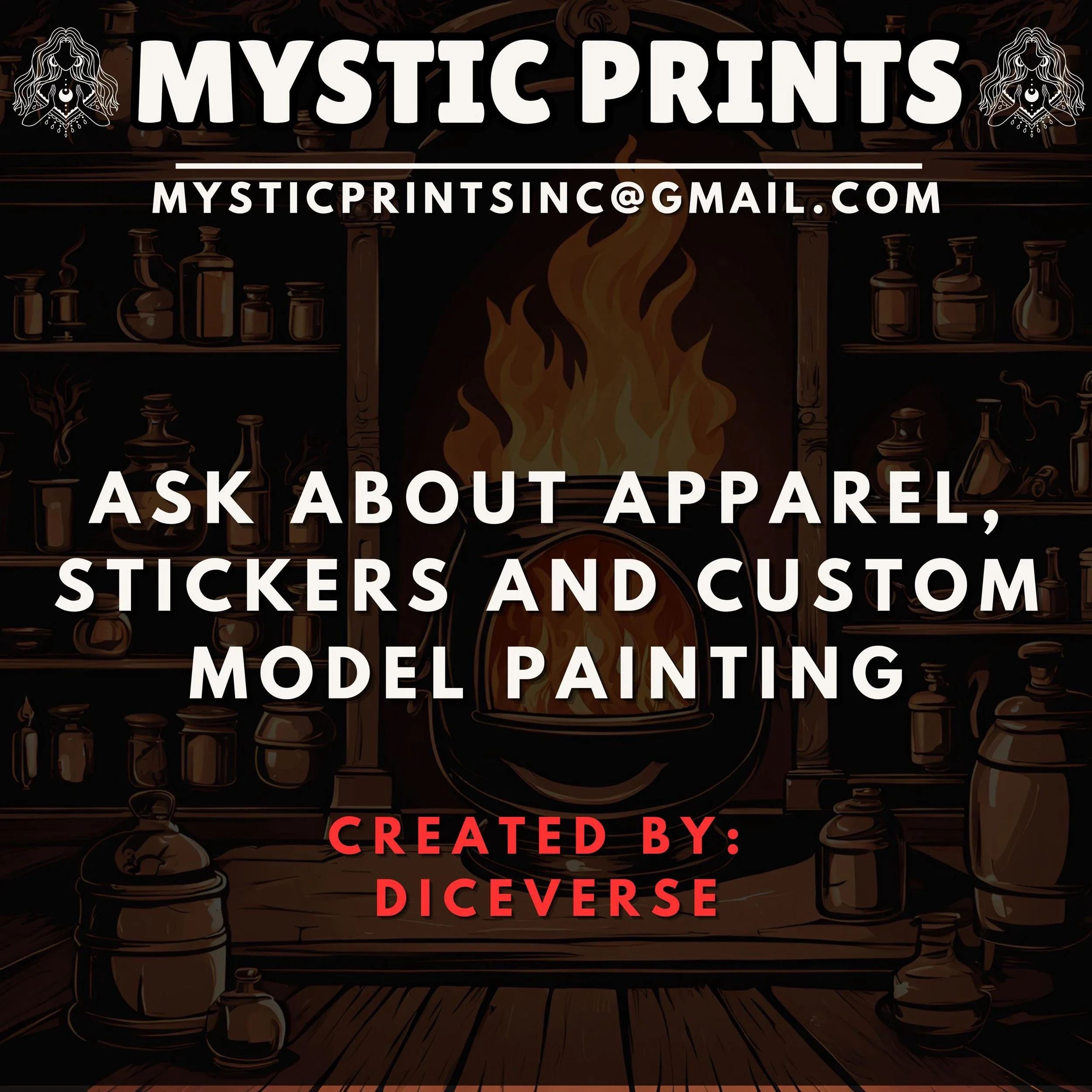 Welcome! Thank you for checking out Mystic Prints! We sell high quality fdm and resin 3D prints as well as custom apparel. Majority of the prints are for Rpgs and Tabletop games such as Dungeons and Dragons and Wargames. We have tons of stl files and can make any apparel that would fit your needs! Design made by Diceverse, License Seller