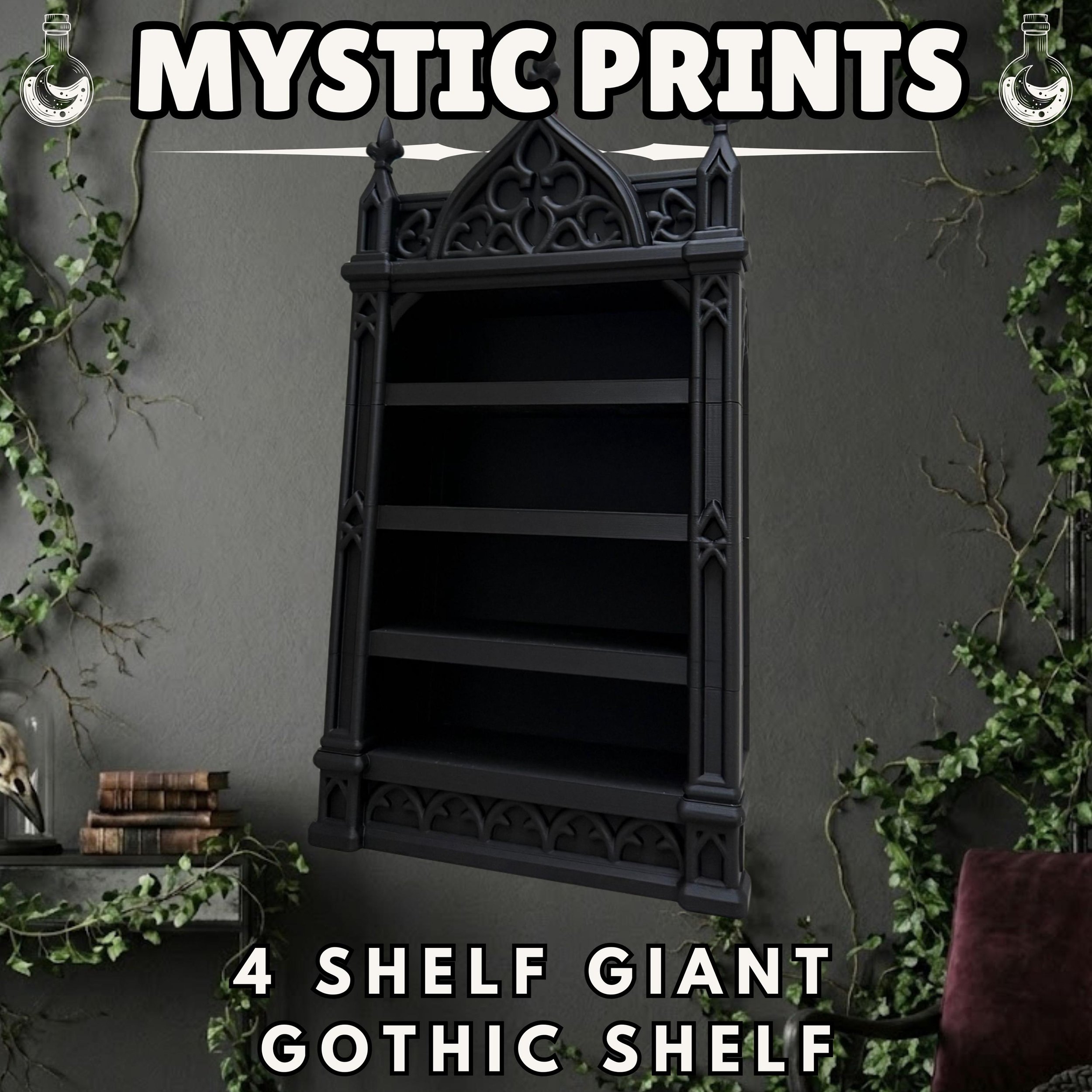 Make a bold statement with this Giant Gothic Wall Shelf designed by Akshan. This massive 4-tier display features intricate cathedral-style tracery, pointed arches, and detailed columns. It is the perfect centerpiece for a dark academia office, a gothic-themed living room, or for displaying a large collection of curios and oddities.