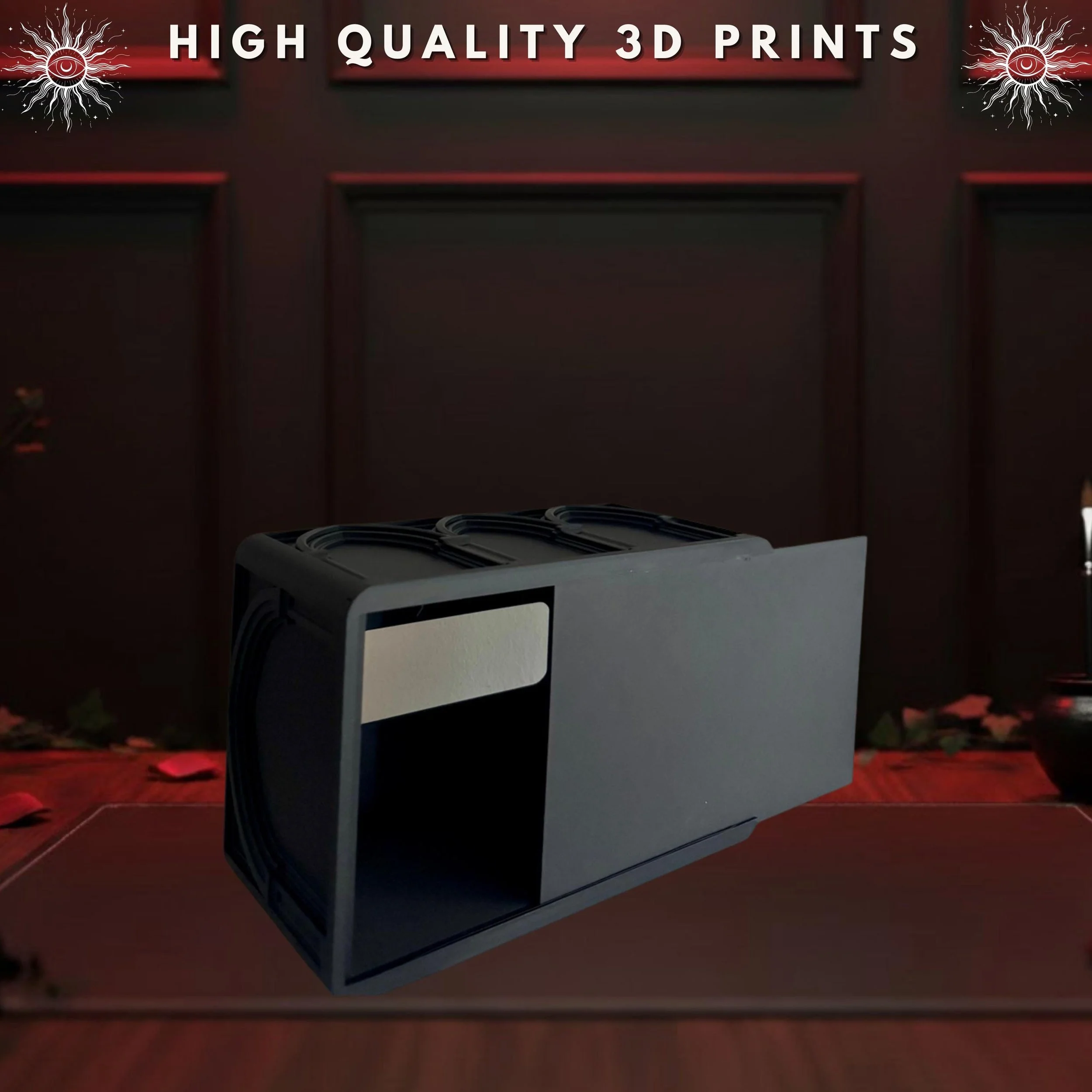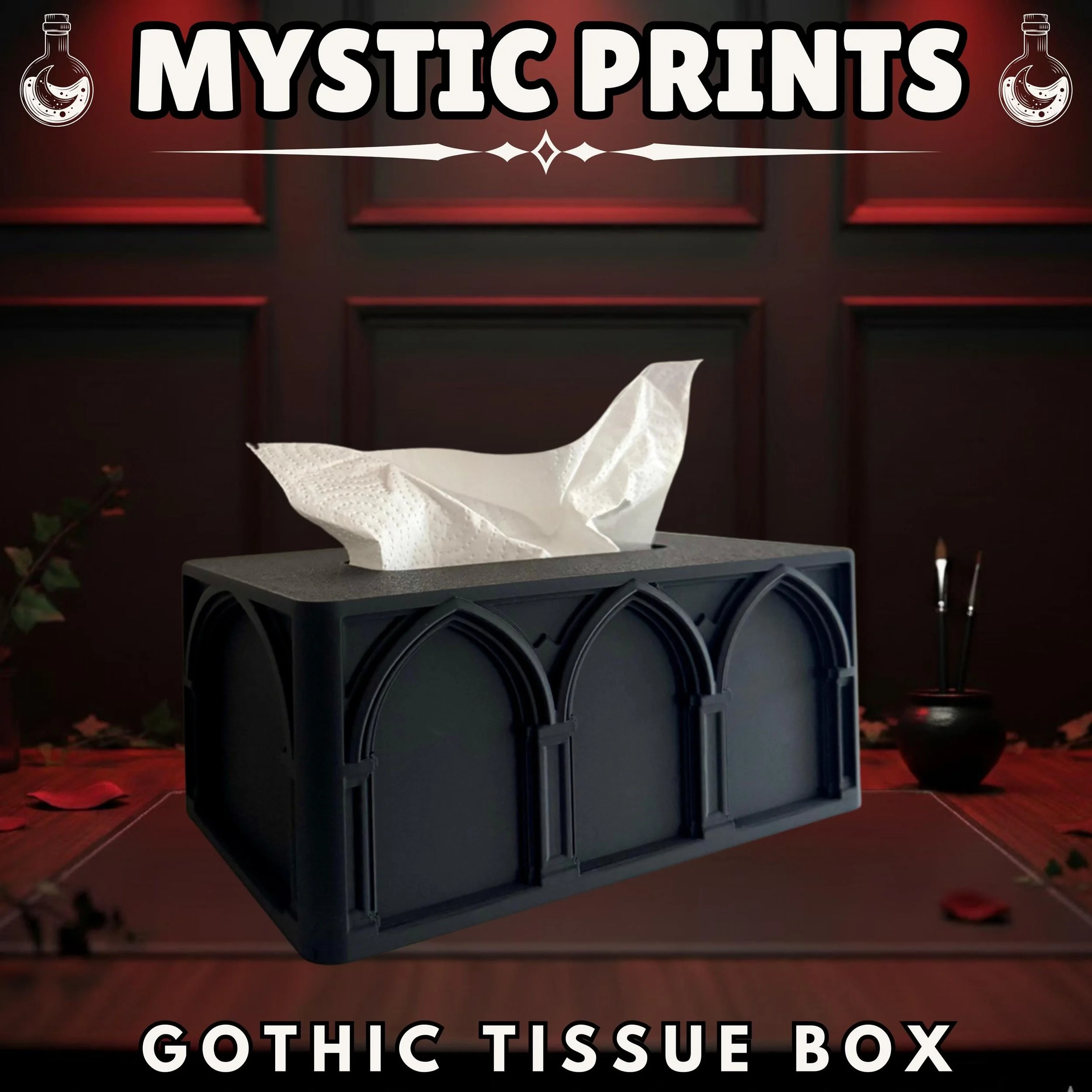 Elevate your everyday essentials with this striking Gothic Arch Tissue Box, a functional piece of art designed by Akshan. This meticulously crafted cover transforms a standard household item into a centerpiece of architectural elegance. Whether you are looking to complete a moody office setup or add a touch of mystery to your living room, this piece serves as the perfect blend of utility and dark aesthetic.