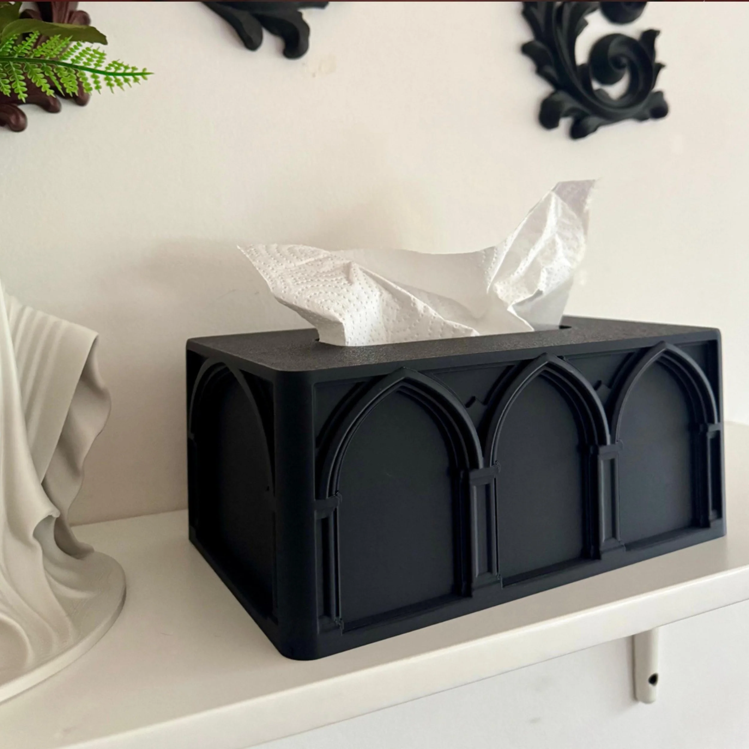 Product Details: Distinctive Gothic cathedral arch architecture on all sides. Designed by Akshan and professionally 3D printed with high-quality materials. Fits most standard rectangular tissue boxes. Durable construction with a premium matte black finish. Easy-to-use slide-over design for quick refills.