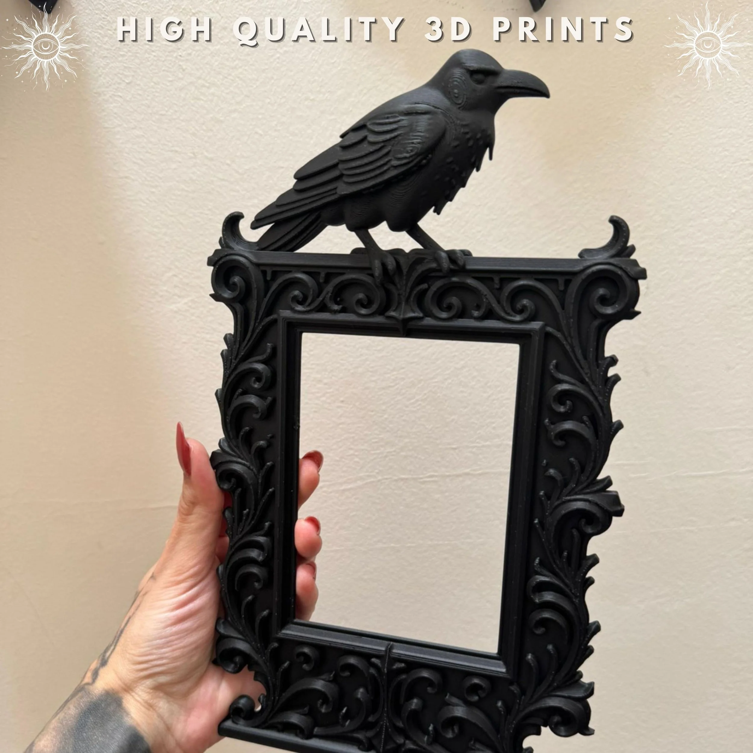 Product Details: Designed by Akshan Material: High-detail 3D printed matte black finish Aesthetic: Gothic, Victorian, Dark Academia, Macabre Display: Suitable for wall mounting or tabletop display Features: Realistic raven topper with ornate baroque scrollwork