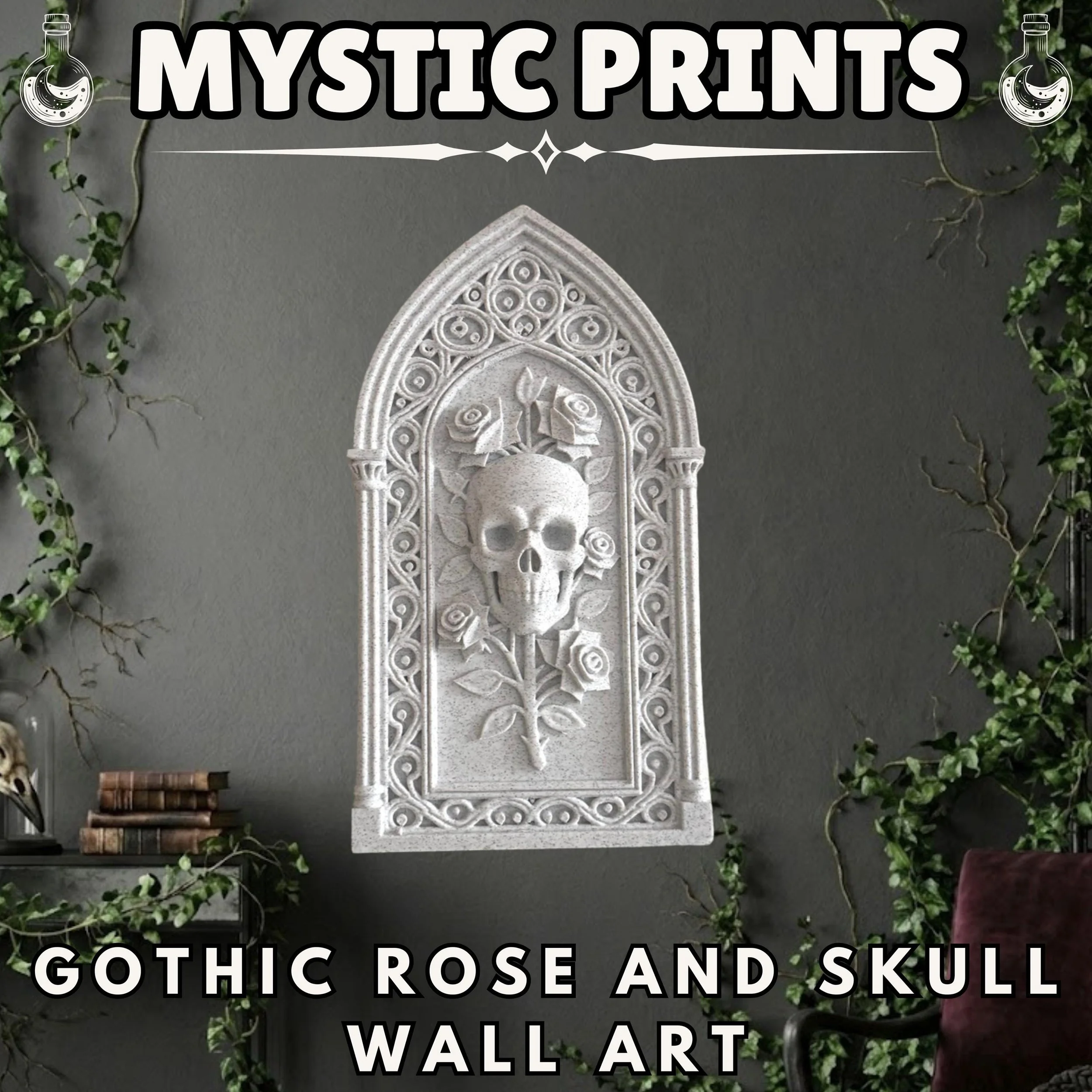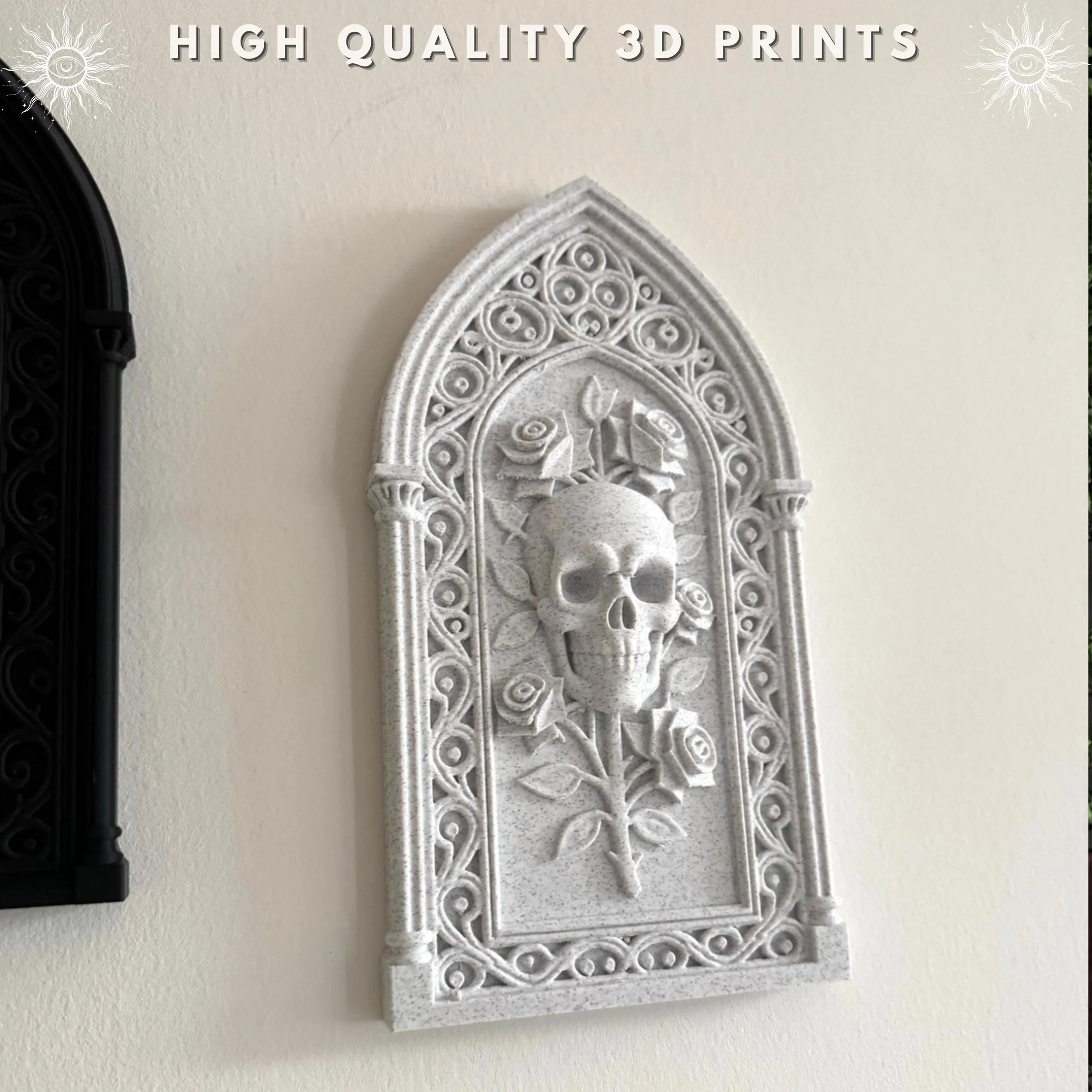 Product Details: Detailed 3D printed skull and rose motif with gothic cathedral arch Designed by Akshan with a high-fidelity stone-like texture Lightweight construction for simple and safe wall mounting Material: Premium PLA with a speckled stone finish Style: Gothic, Memento Mori, Dark Academia, Cathedral Aesthetic
