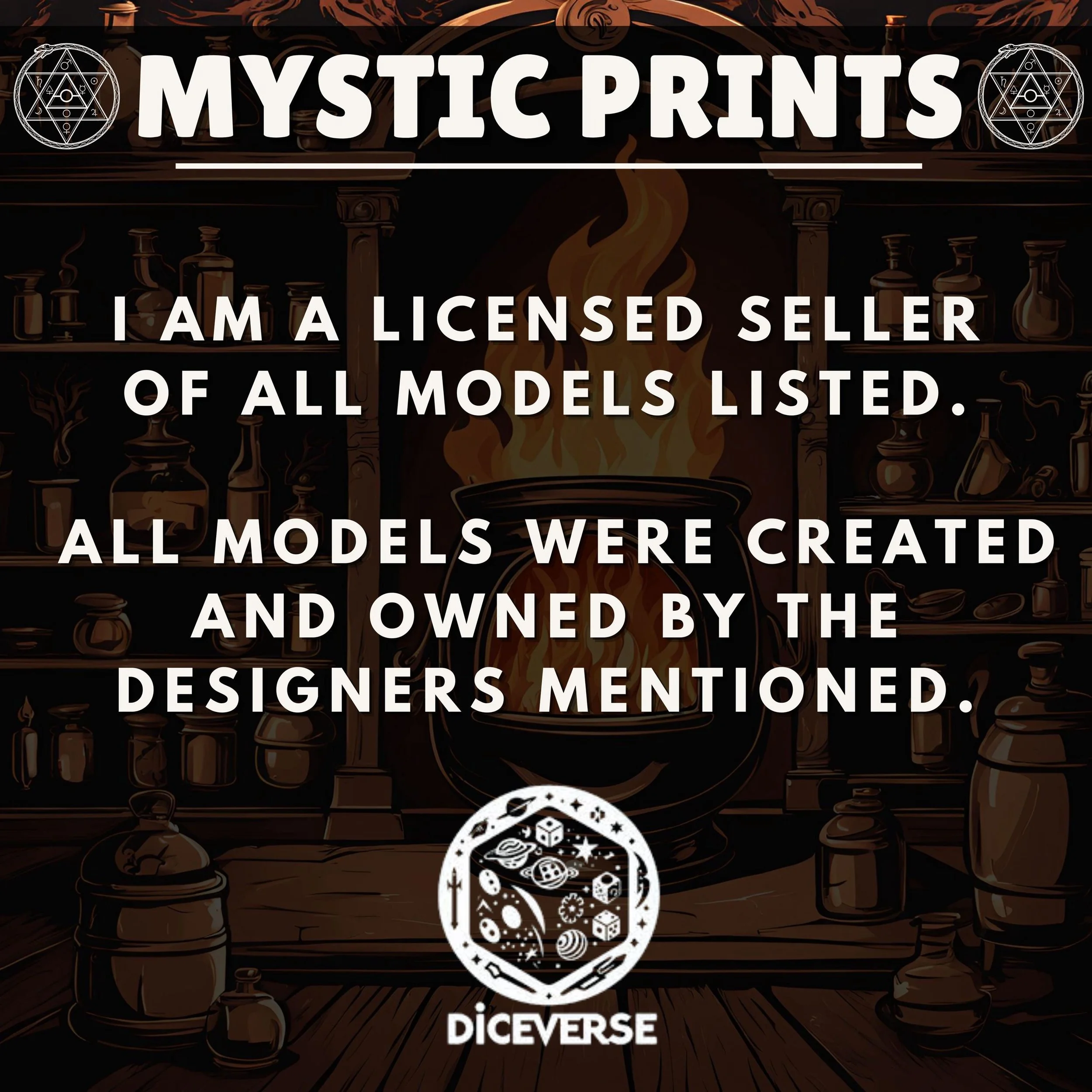 Welcome! Thank you for checking out Mystic Prints! We sell high quality fdm and resin 3D prints as well as custom apparel. Majority of the prints are for Rpgs and Tabletop games such as Dungeons and Dragons and Wargames. We have tons of stl files and can make any apparel that would fit your needs! Design made by Diceverse, License Seller