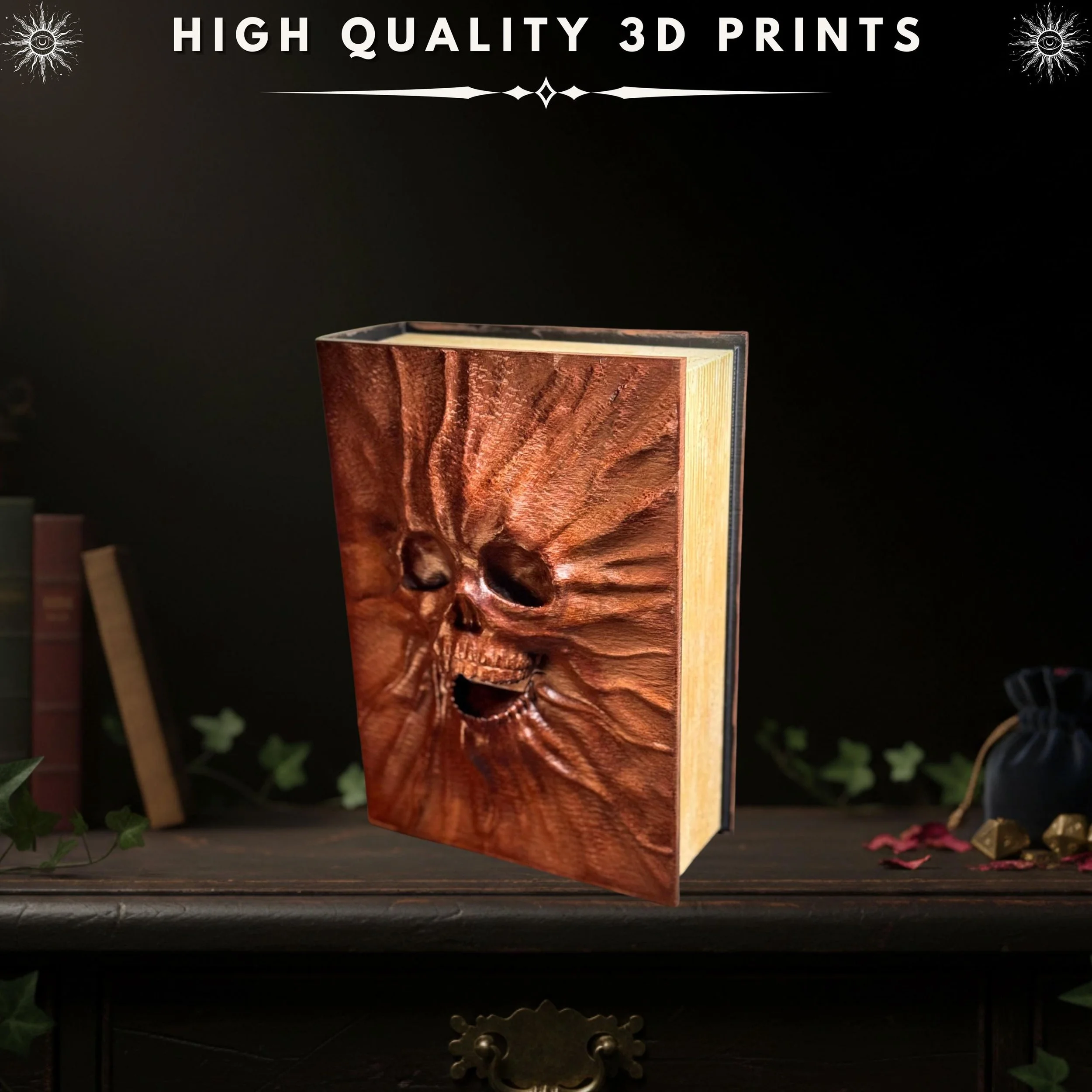 A macabre and functional hidden storage box disguised as a weathered tome. This Skull Book is perfect for tabletop accessories, jewelry, or as a dark academia shelf accent. Choose between raw filament or a professionally hand-painted finish.
