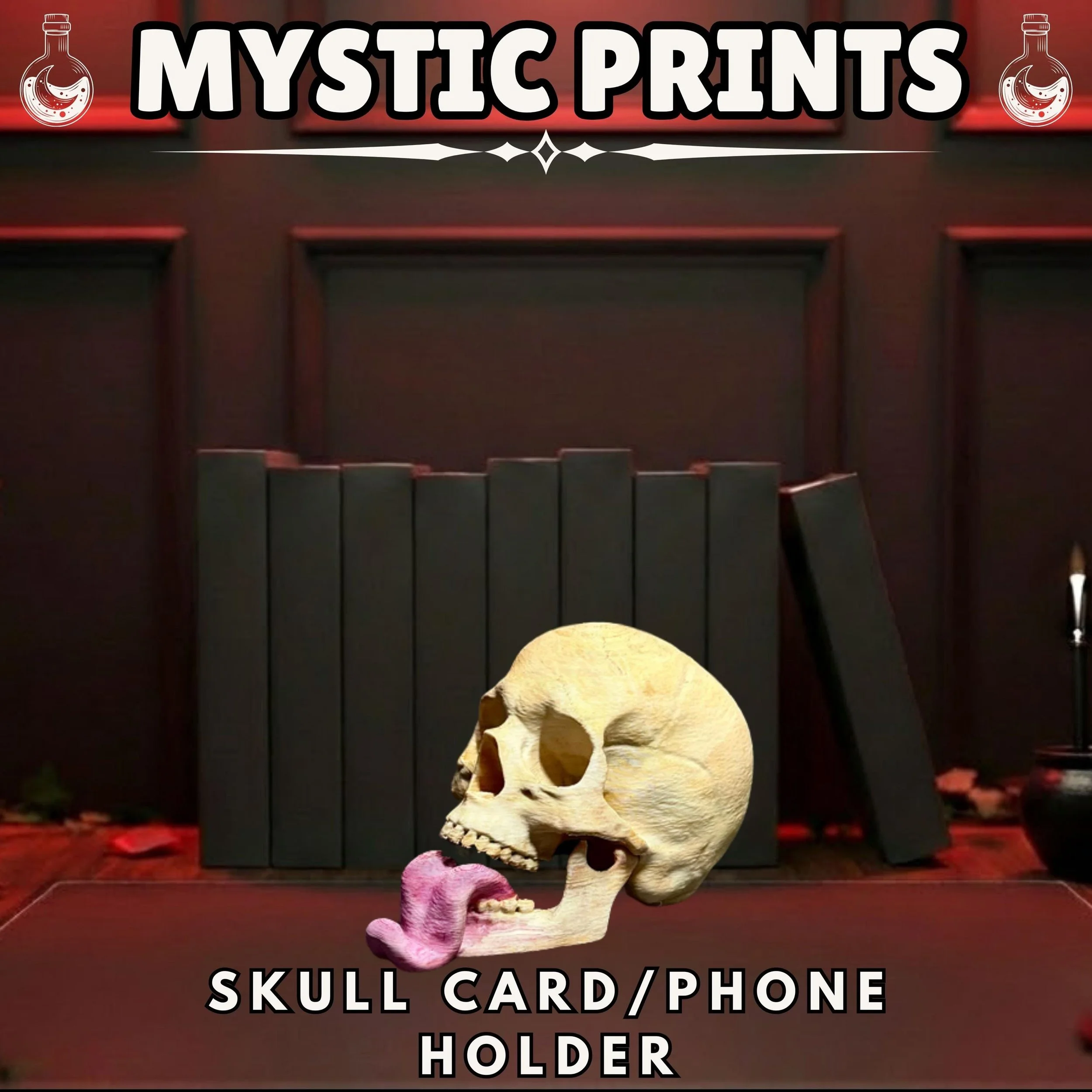 This piece is perfect for fans of gothic decor, dark academia, or anyone who appreciates high-quality 3D printed art. The realistic bone texture and the unique protruding tongue design create a secure "grip" for your devices while serving as a conversation starter. It is a must-have for gamers, horror enthusiasts, or professionals looking to break away from boring office supplies.