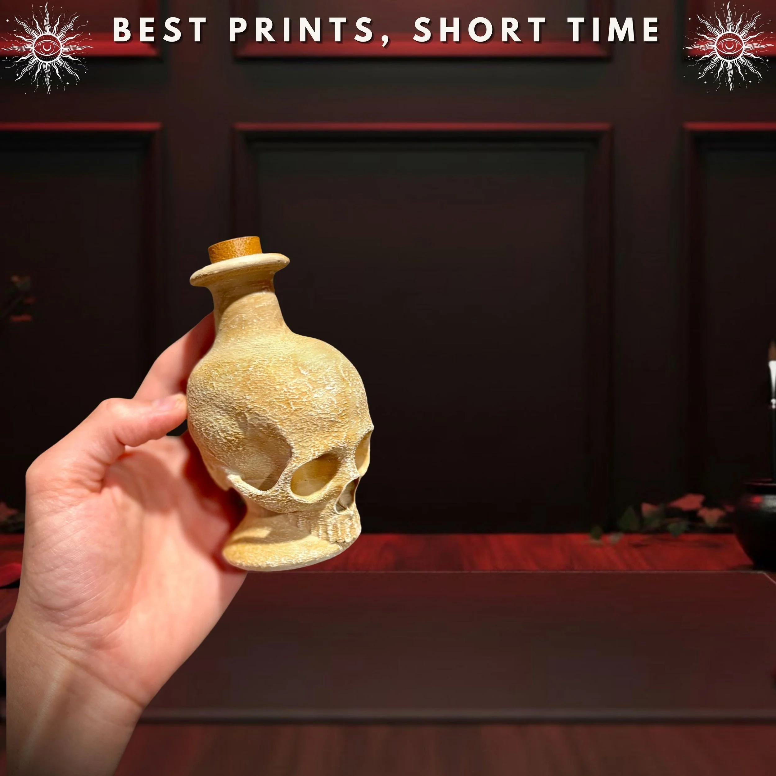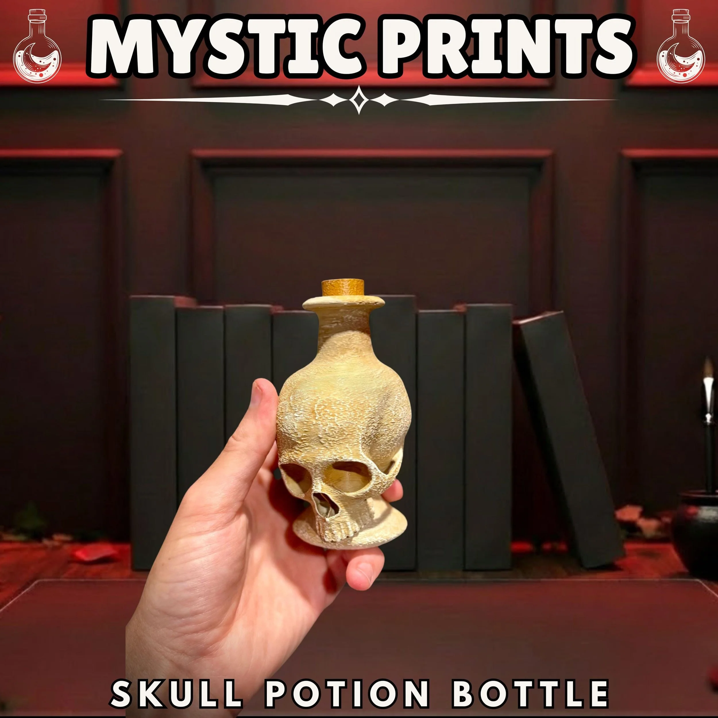 Store your secret elixirs and mysterious potions in style with this hauntingly beautiful Skull Potion Bottle. Designed by the Hooper Family, this unique piece of 3D-printed art is a must-have for any witchy altar, dark academia shelf, or apothecary display.